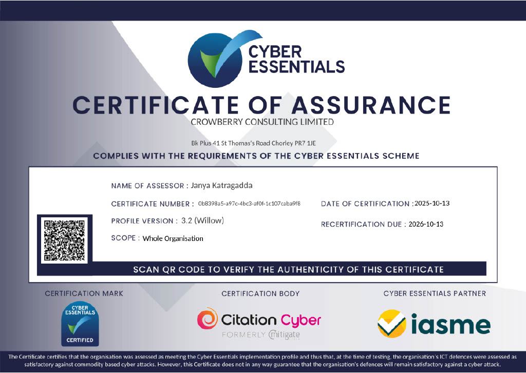 Our Current Cyber Essentials Certificate 2025 – 2026.